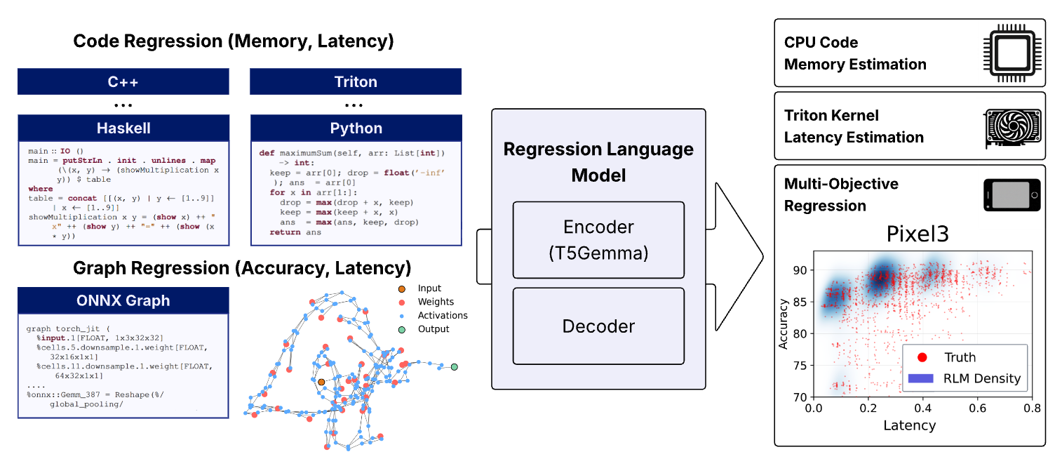 We study code-to-metric regression: predicting numeric outcomes of code executions, a challenging task due to the open-ended nature of programming languages. While prior methods have resorted to heavy and domain-specific feature engineering, we show that a single unified Regression Language Model (RLM) can simultaneously predict directly from text, (i) the memory footprint of code across multiple high-level languages such as Python and C++, (ii) the latency of Triton GPU kernels, and (iii) the accuracy and speed of trained neural networks represented in ONNX. In particular, a relatively small 300M parameter RLM initialized from T5Gemma, obtains > 0.9 Spearman-rank on competitive programming submissions from APPS, and a single unified model achieves > 0.5 average Spearman-rank across 17 separate languages from CodeNet. Furthermore, the RLM can obtain the highest average Kendall-Tau of 0.46 on five classic NAS design spaces previously dominated by graph neural networks, and simultaneously predict architecture latencies on numerous hardware platforms.